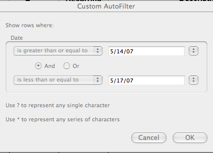 Another great function of AutoFilter is that you can determine money spent in a time period. Go to your Date column and select Custom from the drop down menu. The following window will pop up. (Click picture at left)