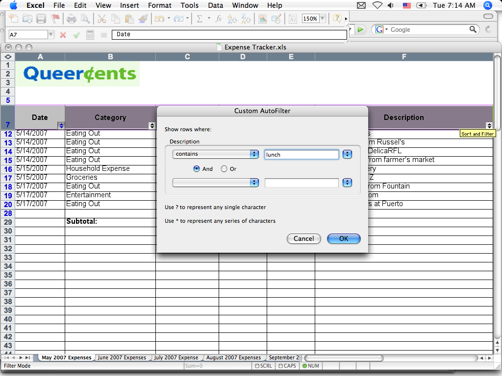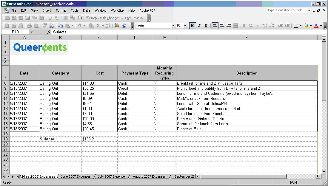 Date: Keep format in month (00)/day (00)/year (2007) format to allow for sorting purposes later. The Queercents Expense Tracker has a tab for each month.