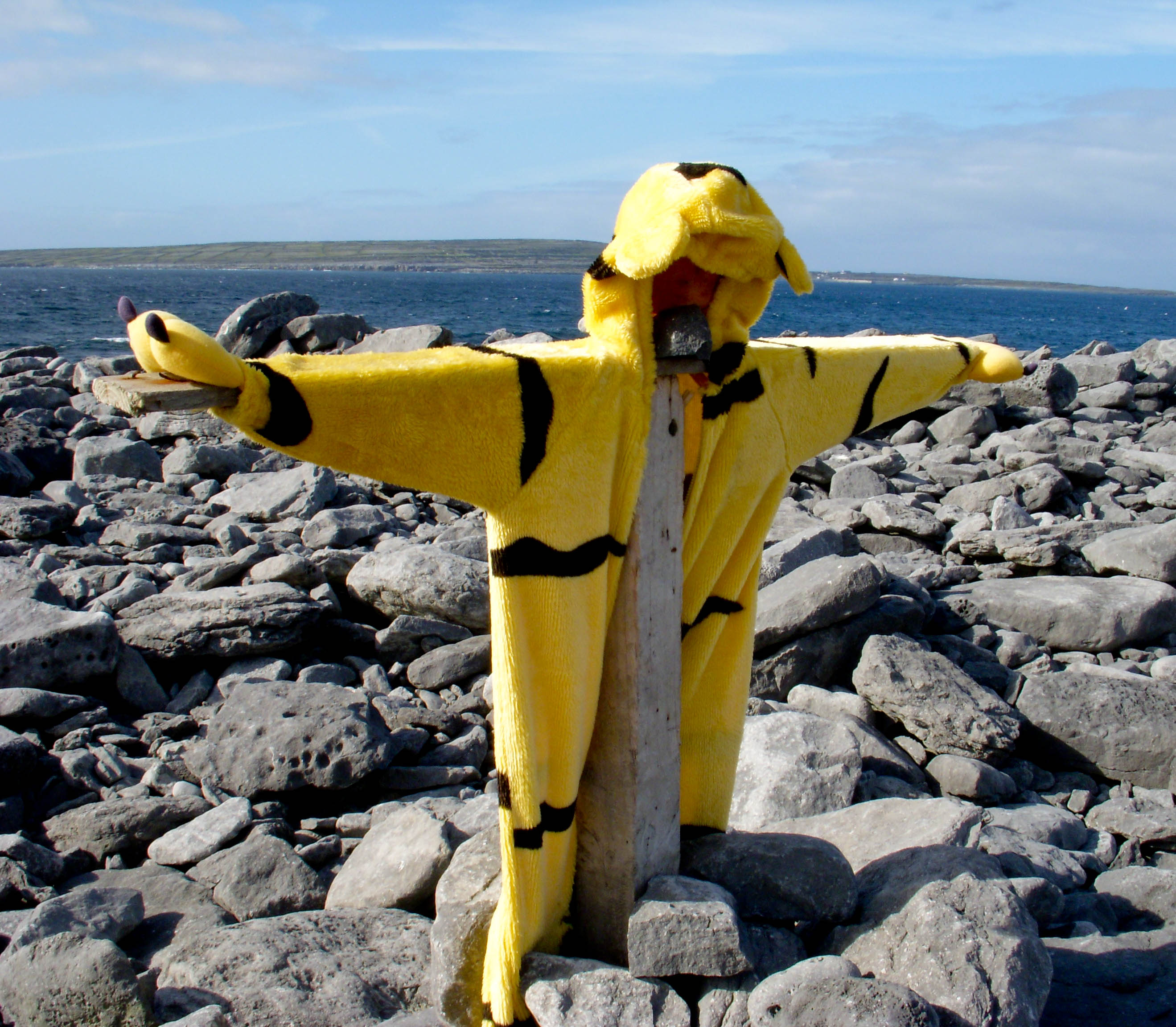 In middle-school I had a relatively goofy English teacher who every day would great the class by exclaiming Happy Monday Everybody! This was not met by much enthusiasm by her students, especially on Mondays, but in retrospect was such an awesome approach to life. You’re at once greating the day and deciding it’s going to be a positive one. I have to admit that I’ve been having a little trouble with this, in the cold, dark Maine winters (especially after over a week spent with a stomach flu) so for today, a picture of a silly scarecrow (?) creature on a rock beach.